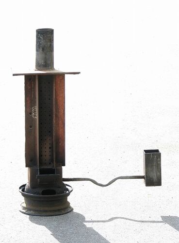 自然吸気の廃油ストーブについて、もっと詳しく写真で見せて欲しいとの要望をいただいたので、写真を撮りました。 ↑全景。以前紹介したものとの大きな違いは、二次燃焼部に放熱板が追加されていることと、燃焼室がプロパンボンベによるドーム型ではなく、直…