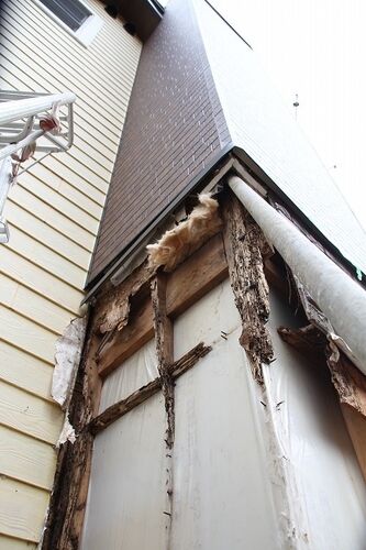 補修工事の途中で煙突が崩壊し、下敷きになって死んでしまったのではないか? と心配している人もいるかも知れないので「煙突ボックス補修1」の続きを紹介します。まだ、どうにか生きてます。 ⇧なんだかブカブカする、ということで表面のサイディングを剥が…
