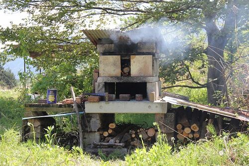 30分で組み立てられる「石積み式・いい加減・石窯」(作り方編1)の続きです。当初、使っていたのは上の写真のような石窯でした。平屋です。火床で焚き火をして石を加熱し、その後、火を掻き出して、そこにパンを入れて焼く、というもの。ただしこのタイプだ…